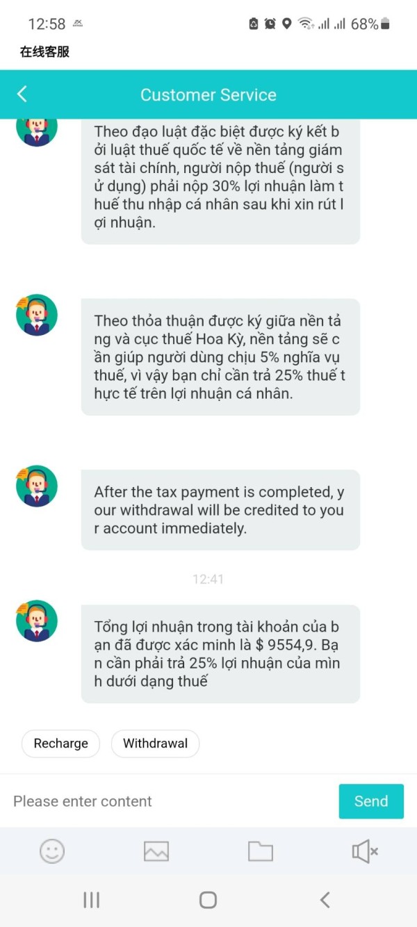tôi bị lừa nạp tiền vào và không thể rút bây giờ còn yêu cầu đóng thuế cho tài khoản lạ,,lúc tôi nạp tiền cũng bị lừa gửi tiền từ tài khoản Huobi của mình đến một tài khoản khác,chứ không trực tiếp nạp tiền đây là link ứng dụng http://www.huihuitong.site..tôi đã bị lừa xin được trợ giúp