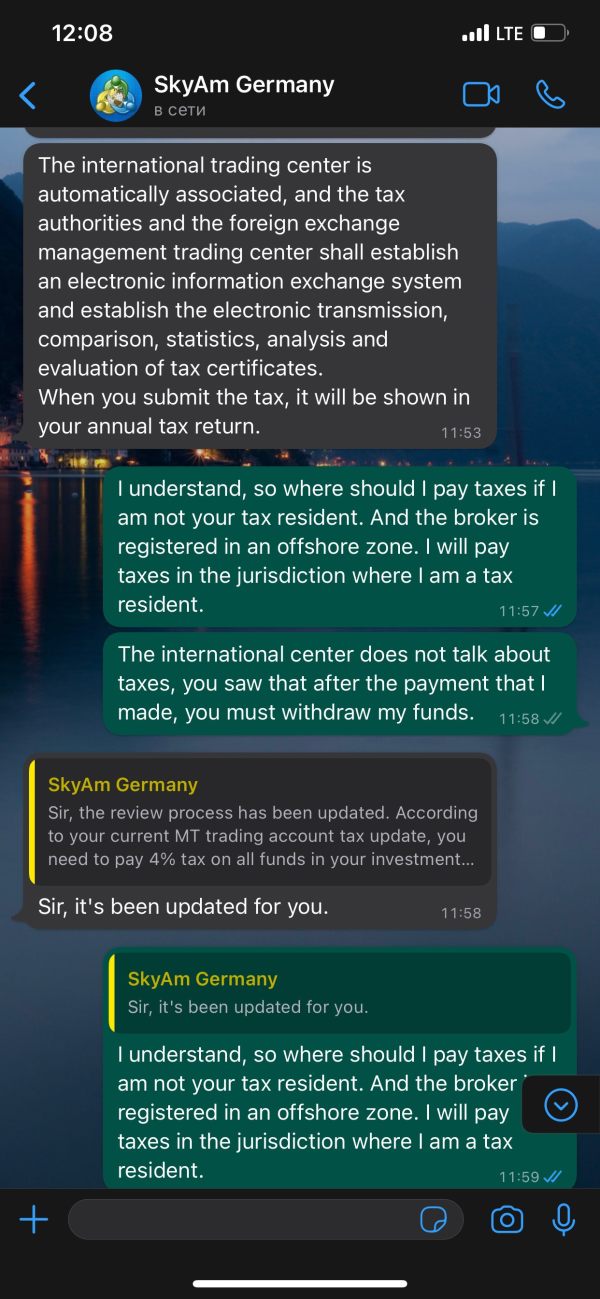 в продолжение истории по отсутсвию возможности вывода денег с платформы. я нашёл ещё контакты этого «брокера», которому так же написал, что я хочу вывести часть денег со своего торгового аккаунта, и тут появилась новая история про налоги которые я должен оплатить, но в какой юрисдикции и почему я должен платить там налоги, сервис не может объяснить. так как я плачу налоги там, где являюсь налоговым резидентом. не отправляйте ни одной копейки этому брокеру, вы просто потеряете эти деньги. А новые причины о невозможном выводе будут возникать и дальше, до бесконечности. вот контакт который работает по Германии: +49 1520 6031314 контакт который называется международной торговой организацией по валюте МТ4: +1 (571) 461-5038. не доверяйте этому брокеру и не доверяйте предложению заработка на торговле, если вы лично не знакомы с человеком и гарантом вывода Ваших средств.