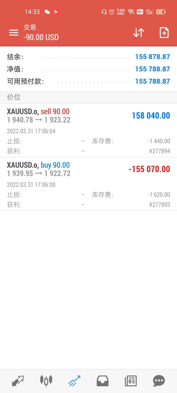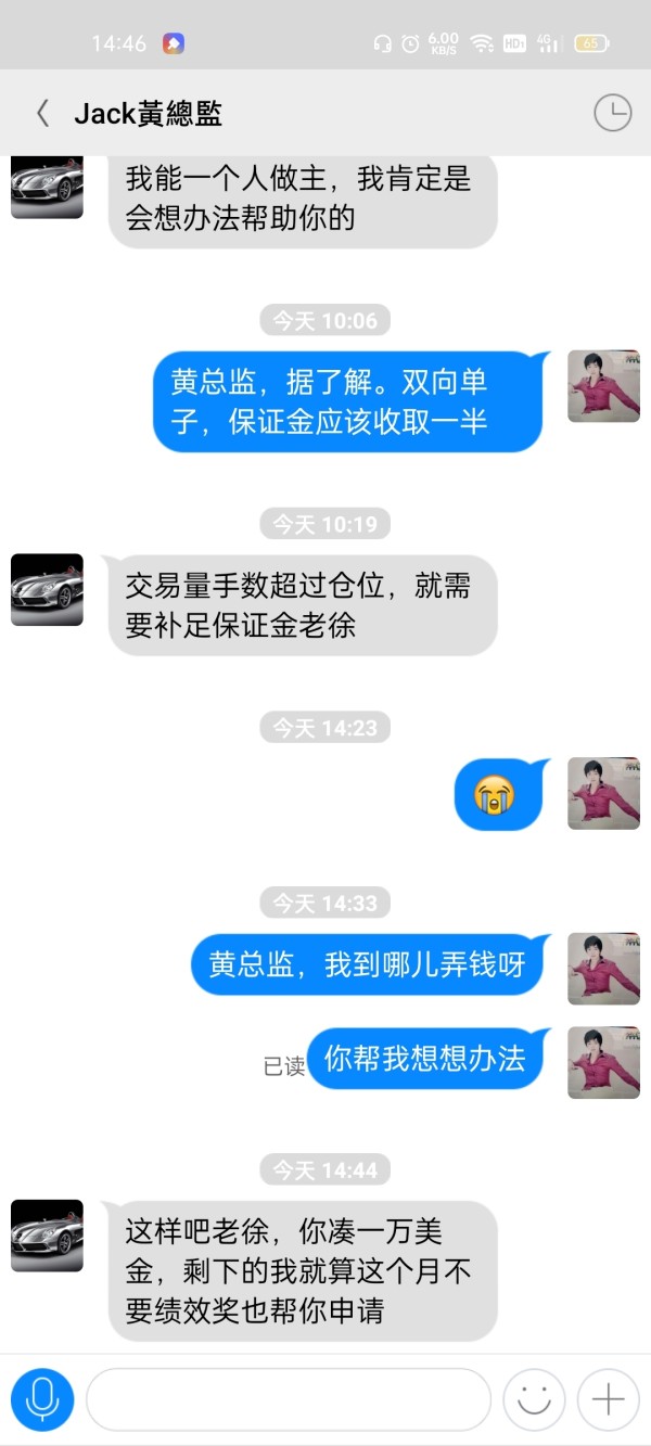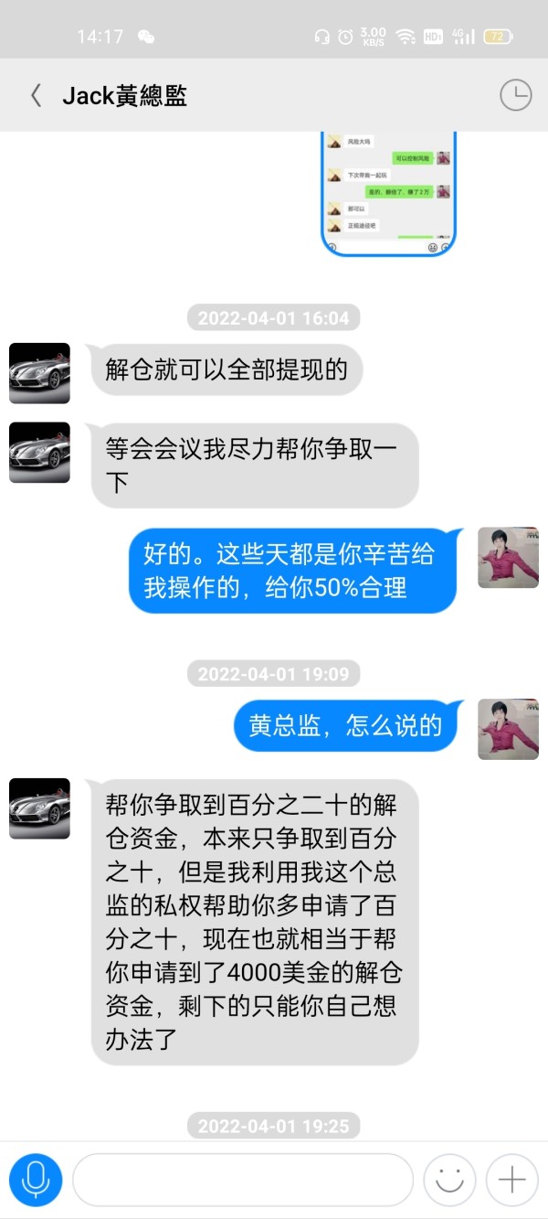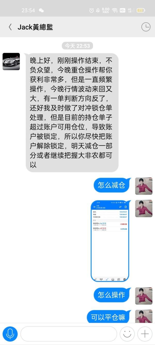 初期投入一万美金,分析师都是轻仓操作,后来不停让我们加仓,加到2万美金,五个工作日资金翻倍,。2022.3.31重仓操作,双向单子被锁仓,要让入金15万人民币左右才能解仓,后来又说董事会开会申请给我们4000美金,然后自己解决其他钱。