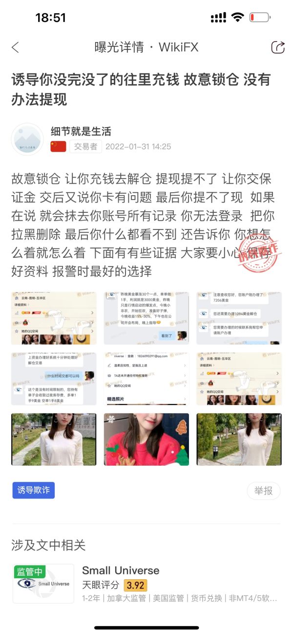 通过抖音,找到目标,然后带你炒股,然后带你进群,然后老师讲课,通过4-5个月的时间让你信任,带你抄金,通过减点差,送彩金等活动诱导贷款充值,群里你能联系到了都是托,然后骗取账号,进行大额对冲交易锁仓,就算解锁了,还有其他方式让你继续充钱,我已经找到同一伙人诈骗其他人的记录,希望大家以后搽亮眼睛,也希望平台能够严厉惩罚。