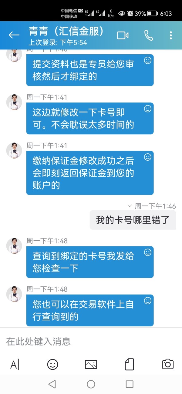 入金7000,赚到21350后,申请出金,客服以卡号错误为由拒接出金,我核对交易平台和当时开户发给她的卡号核对是正确的,她说是错的,要我出2万元的保证金才可以更换卡号申请出金。