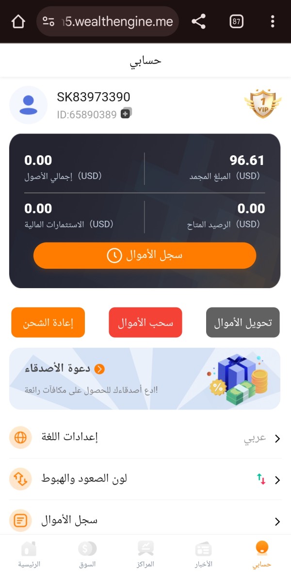 اريد الابلاغ عن منصة wealth engine لقد قامت بتجميد حسابي وكل الحسابات قامت بتجميد المال ولم نستطع السحب . طلبت من إعادة شحن أكثر من 100 دولار لفك الشحن . وهذا ليس مشكلتنا لماذا نقوم بالشحن لقد اخذت كل اموالي . وتريد النصب علينا .