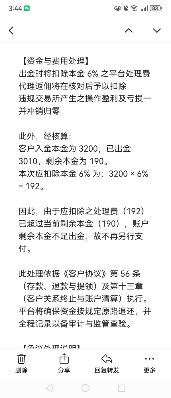 ฉันได้ขอถอนเงินหลังจากฝากเงินเข้าไป และแพลตฟอร์มพยายามจะหักค่าธรรมเนียม 6% โดยให้เหตุผลว่า "ไม่มีประวัติการซื้อขาย\" ฉันคิดว่าสิ่งนี้ไม่สมเหตุสมผลและยอมรับไม่ได้โดยสิ้นเชิง