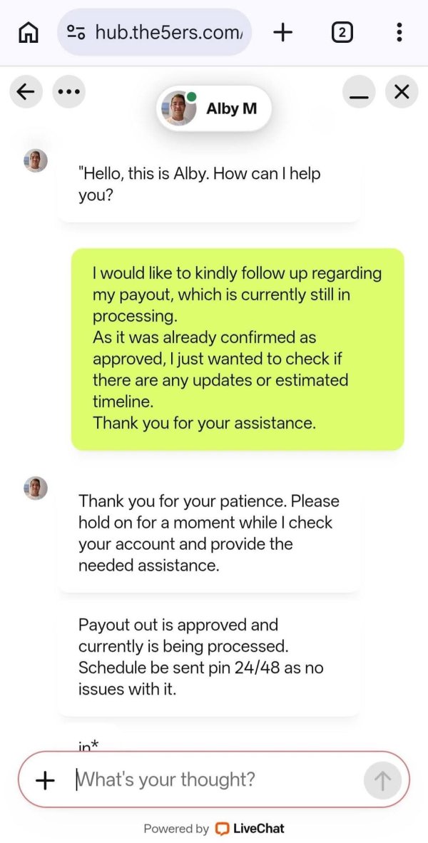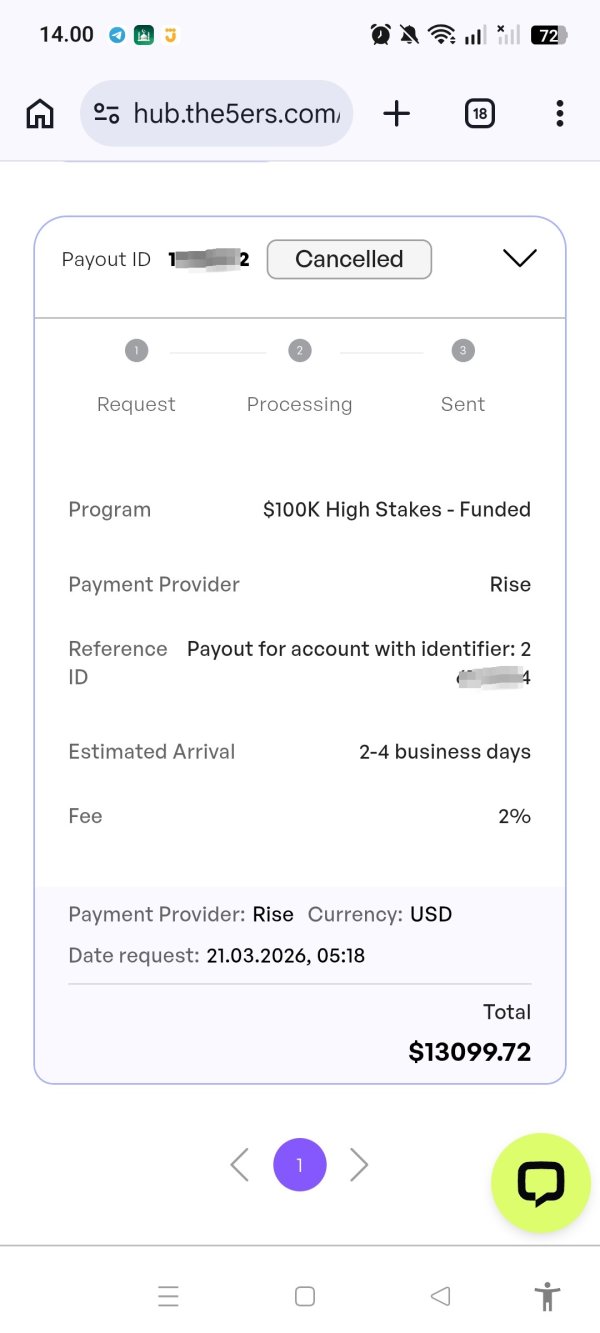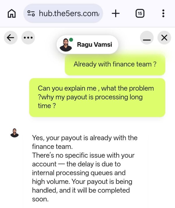 Sharing my experience with The5ers. Payout requested: March 21, 2026 (~$13K) Interview completed & account approved: March 24 March 28: Support confirmed everything was approved, no issues, and payout would be sent within 24–48 hours After that, I followed up multiple times and was always told: Payout is approved No issues on the account Funds are being processed As recently as yesterday, support said my payout was already with the finance team. However, after more than two weeks of waiting, I suddenly received a termination notice citing “integrity concerns” — with no prior warning, no clear evidence, and no chance to clarify. So the question is simple: If there was an issue, why was the payout approved and confirmed multiple times? This kind of process is very difficult to understand and raises serious concerns about transparency and consistency. Traders should be cautious and make sure to document everything. I’m open to a clear and transparent explanation from the team.