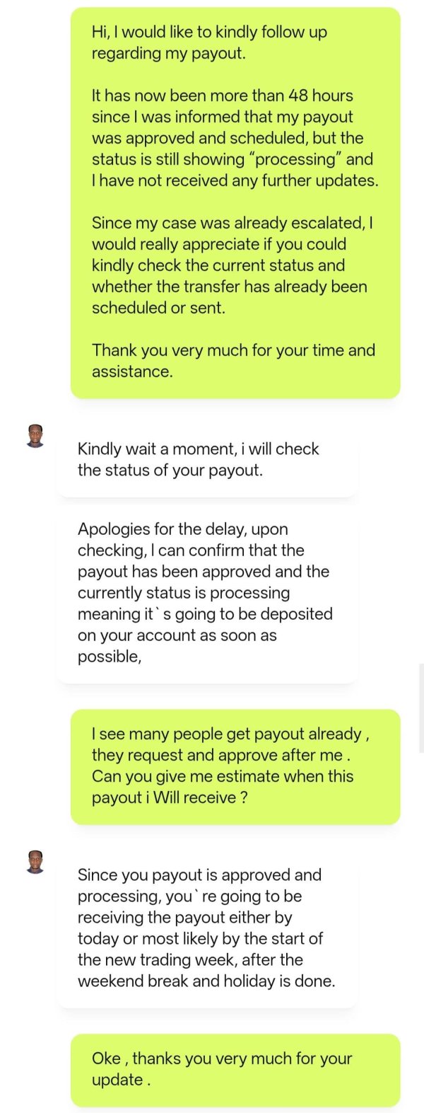 แบ่งปันประสบการณ์ของฉันกับ The5ers คำขอจ่ายเงิน: 21 มีนาคม 2026 (~13,000 ดอลลาร์) การสัมภาษณ์เสร็จสิ้นและบัญชีได้รับการอนุมัติ: 24 มีนาคม 28 มีนาคม: ทีมสนับสนุนยืนยันว่าทุกอย่างได้รับการอนุมัติ ไม่มีปัญหา และจะส่งเงินจ่ายภายใน 24–48 ชั่วโมง หลังจากนั้น ฉันได้ติดตามถามหลายครั้งและได้รับคำตอบเสมอว่า: การจ่ายเงินได้รับการอนุมัติแล้ว ไม่มีปัญหาใดๆ กับบัญชี เงินกำลังอยู่ในขั้นตอนการดำเนินการ ล่าสุดเมื่อวานนี้ ทีมสนับสนุนยังบอกว่าการจ่ายเงินของฉันอยู่กับทีมการเงินแล้ว อย่างไรก็ตาม หลังจากรอคอยมานานกว่าสองสัปดาห์ ฉันก็ได้รับแจ้งการยกเลิกบัญชีกะทันหัน โดยอ้างถึง "ข้อกังวลด้านความซื่อสัตย์" — โดยไม่มีการเตือนล่วงหน้า ไม่มีหลักฐานชัดเจน และไม่มีโอกาสได้ชี้แจง ดังนั้นคำถามจึงง่ายมาก: หากมีปัญหา ทำไมการจ่ายเงินถึงได้รับการอนุมัติและยืนยันหลายครั้ง? กระบวนการแบบนี้เข้าใจได้ยากมากและทำให้เกิดข้อกังวลอย่างจริงจังเกี่ยวกับความโปร่งใสและความสม่ำเสมอ เทรดเดอร์ควรระมัดระวังและอย่าลืมบันทึกทุกอย่างไว้เป็นหลักฐาน ฉันยินดีรับคำอธิบายที่ชัดเจนและโปร่งใสจากทีม
