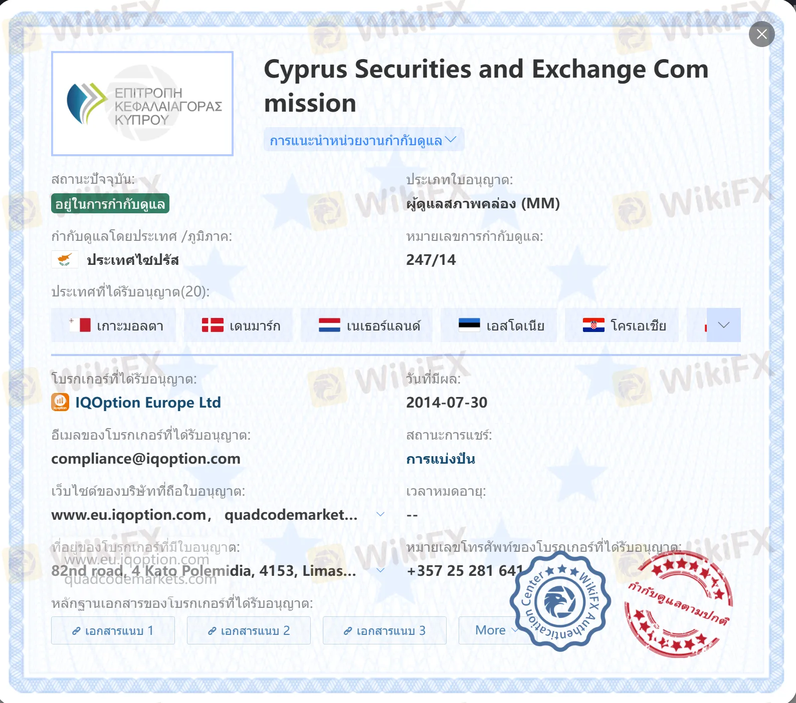 สามารถตรวจสอบได้จากเว็บไซต์ CySEC โดยตรงบนทะเบียน entity IQ Option Europe Ltd หมายเลข 247/14