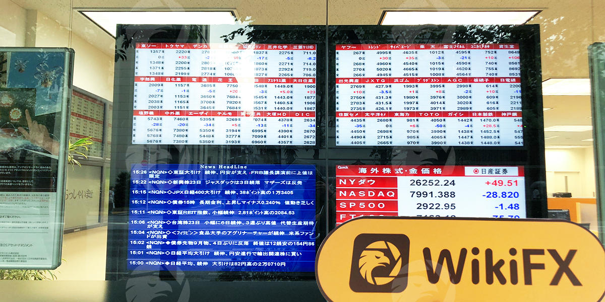 นักสำรวจพบว่าหน้าจอขนาดใหญ่แขวนอยู่ด้านหนึ่งของสำนักงานโดยแสดงข้อมูลตลาดและข่าวธุรกิจ