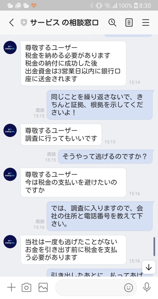Ana parayla birlikte kârın yaklaşık %20.315'ine (yaklaşık 4 milyon yen) tekabül eden yaklaşık 33 milyon yen çekmeye çalıştığımda buna vergiler deniyordu çünkü sitesinde, kârın %20,315'i (yaklaşık 4 milyon yen) tutarında bir ücret tahsil edildi. İsteksizce ödedi, ancak şimdi para aklama şüphesiyle fonlar donduruldu. Fonları eritmek için %3'lük bir depozito (1.000.000 yen) gerektiğini açıkladı. (Depozitonun daha sonraki bir tarihte iade edileceğini açıkladı.) Bir noktada şirket, depozitonun yarısını karşılayacaklarını söyleyerek ödemeyi 500.000 yen'e düşürdü, ancak şirket herhangi bir ödeme göstermediği için ödemeyi reddetti. ödemek zorunda olduklarının kanıtıdır. Şirketin açıklamasına göre, depozitonun ödenmemesi durumunda fonlar dondurulmaya devam edecek ve nihayetinde ödemeye dahil olan üçüncü taraf para transferi şirketine ait olacaktır. Şirket sorumsuzca şirketle hiçbir ilgisi olmadığını açıkladı. Yardım gitmedi ve cevap vereceklerdi ama depozitoyu ödemem konusunda ısrar ettiler. Bu güne kadar parayı çekemedim.