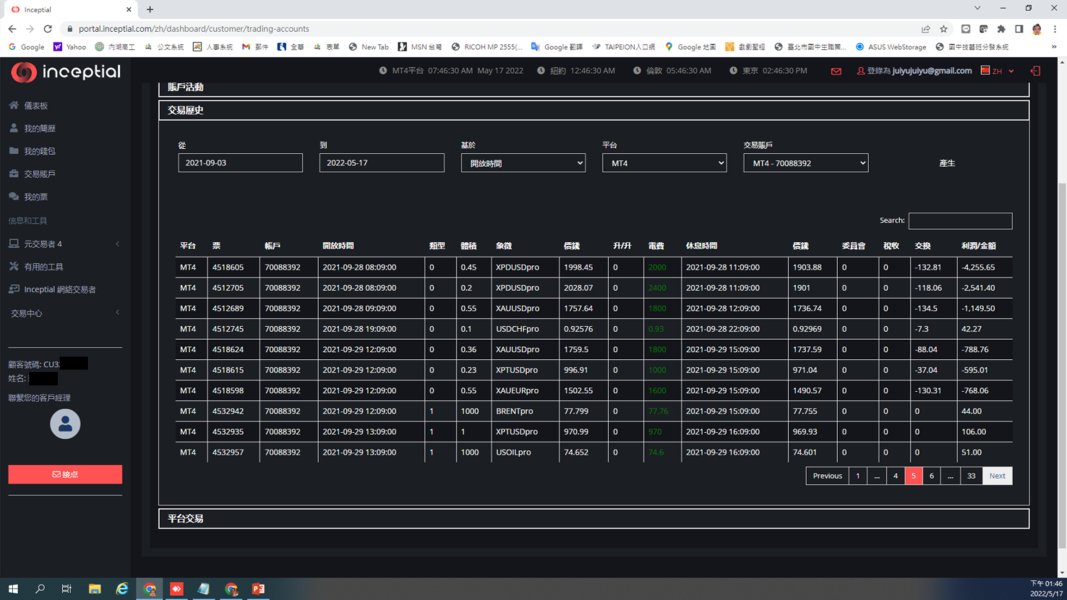自從2021年9月,被eXcentral公司(之前在這個平台也爆掉約3萬多美金)轉介至Inceptial公司,該公司不斷要我存入保證金投資,帶我操作投資,一有賺錢就會爆倉,爆了倉就換一位經理人,說要幫我把虧損賺回來,但一次又一次全部都爆光,最後由該公司的副經理接手,說他是高層,有更精確的消息,要我再投入資金參加一個專案投資,可以幫我將之前的虧損賺回來,結果該投資說已賺進30萬美金,為了要拿到該筆金額,又不斷要我入金,說什麼要繳手續費、稅金、刷投資量…等等,結果這些錢也在平台上都爆光光,副經理都說不影響,現在投入的資金全都爆倉光了,那30萬美金說2022年4月5日可以進來,但至今音訊全無。(交易照片很多,僅列部分參考)