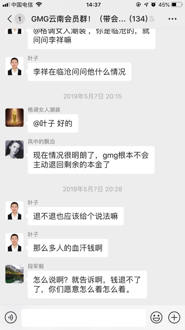 我于2017年8月底被高中同学赵继宇(也是受害者)拉入GMG外汇平台做外汇,赚取交易手续费佣金,约定合同期一年,结果2018年3月底又被该平台人被迫我们转他们所谓的A计划,再次约定合同期一年,无形中延长了合同期限,在交易中,我们的本金越弄亏损越多,我们已要求停止交易并退还本金,他们说要出违约金,除非等到合同到期,到2019年3月底合同到期他们一直以各种理由不退本金,本金一直在MT4账户,他们还把GMG出金平台注销了,在云南区受害人的本金大概有200多万,这是金融诈骗及非法融资