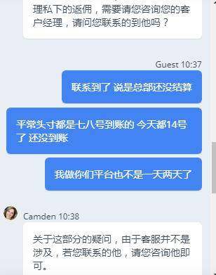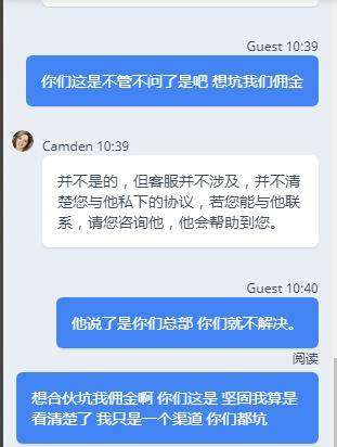 答应给我的头寸不反,一开始说的好好的,平常佣金七八号就到账了,现在十七号还没到账,一拖再拖,坚固环球太黑了,找客服,客服就是找理由不解决,