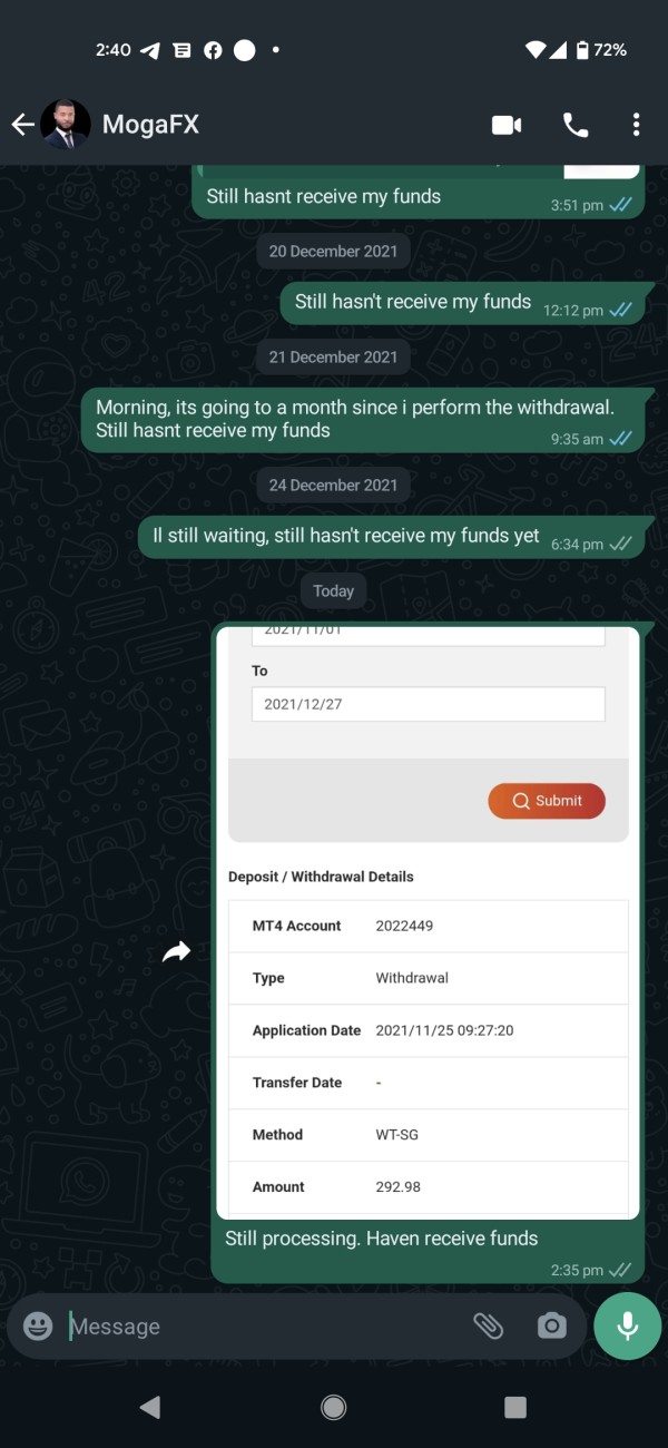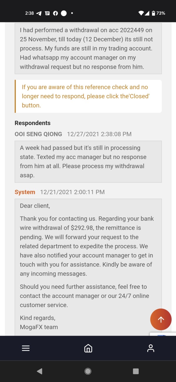 performed my withdrawal on 25 November but till today still couldn't get my funds back. service desk pushing responsibility to account manager but no response from acc manager. no more blue tick in WhatsApp suspected acc manager blocked me.
