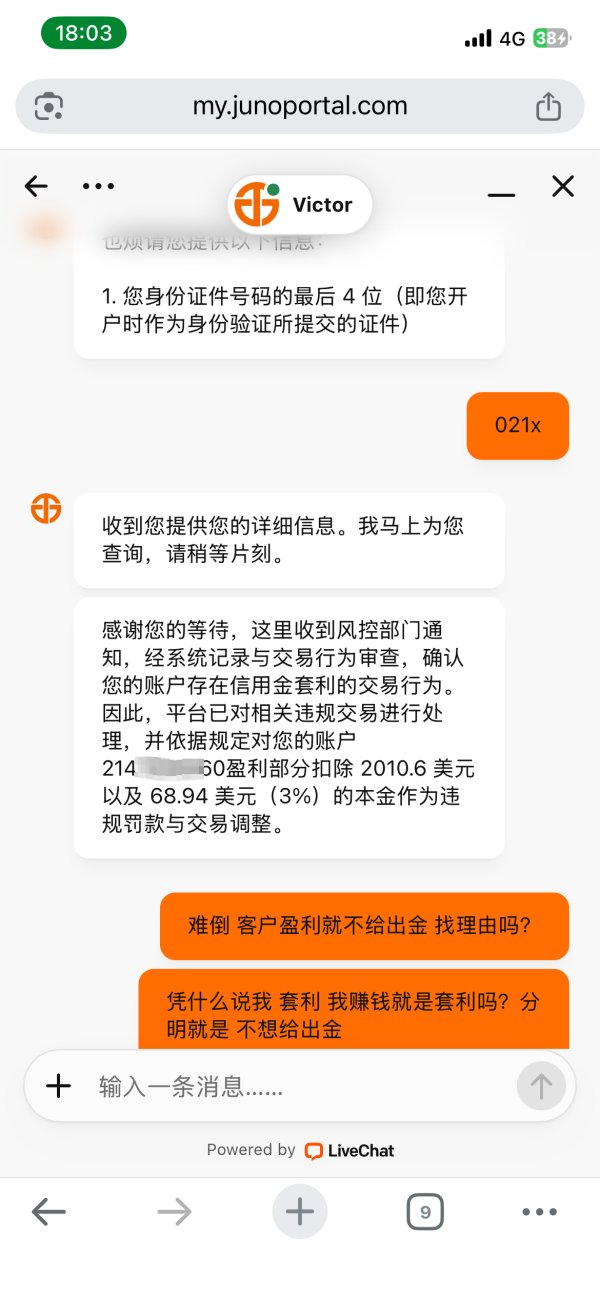 君诺这个 黑平台 亏钱了啥事儿没有 .盈利了不给出金. 说违规交易 信用金套利 但是没有证据表明我违规 .联系客服 让我发邮件 邮件发出去 没有回复. 死皮赖脸的就是 不给出金 . 同样的操作亏空了 没事 赚钱就是 不给 到后来 后台直接进不去