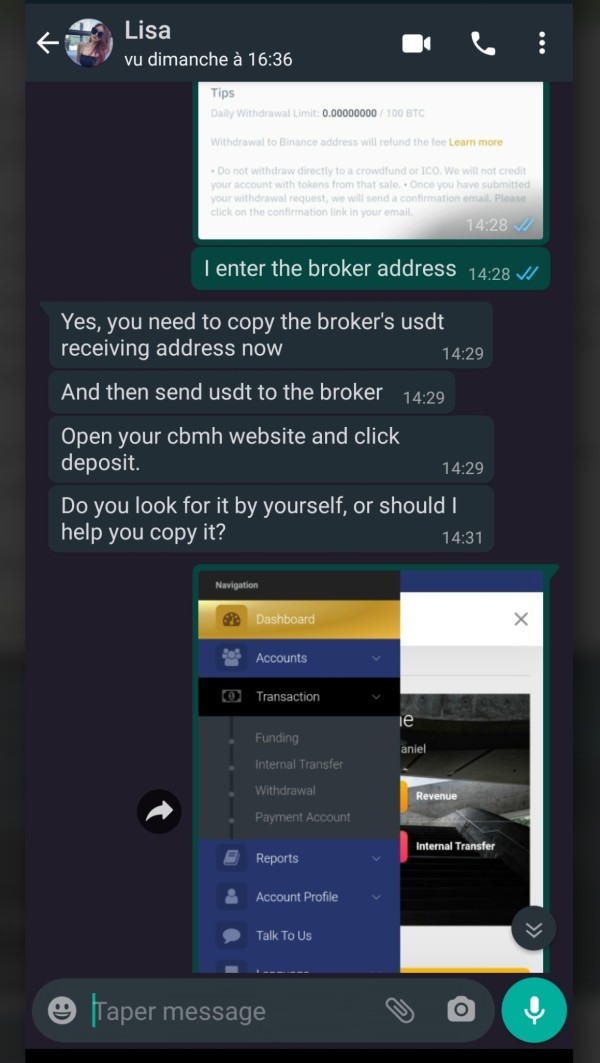Môi giới lừa đảoCBMH LIMITED đã lấy trộm 25000 euro từ tôi Người bắt đầu chủ đềElyus Ngày bắt đầu 28 tháng 7, 2021 ThẻCBMH giới hạnCBMH ltd Tôi là người Pháp và tôi có một bài đăng ở đây vì tôi đã bị lừa bởi một nhà môi giới Trung Quốc có tên làCBMH GIỚI HẠN thông qua một cô gái tôi gặp trên Facebook hẹn hò. Tôi đã được một cô gái Trung Quốc tên Lisa giới thiệu về trò lừa đảo để đầu tư vào vàng thông qua người môi giớiCBMH LTD trên nền tảng MT4.
