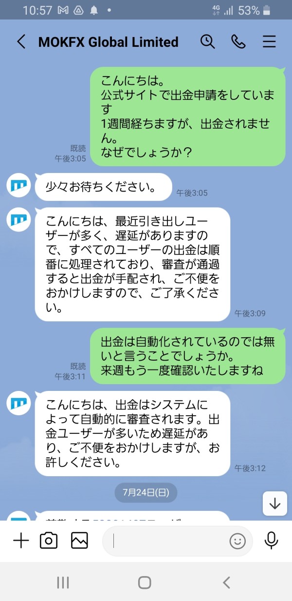 Một phụ nữ Đài Loan sống ở Nhật Bản đã gặp tôi trên LINE và nói với tôi rằng chú của cô ấy có công nghệ FX và rằng nếu tôi bắt chước chú của anh ấy, tôi có thể giành chiến thắng. MOKFX được cô ấy giới thiệu và tôi đã mở tài khoản theo hướng dẫn của cô ấy. Tôi tin tưởng cô ấy vì tôi đã kiếm được lợi nhuận bằng cách làm những gì cô ấy nói. Sau đó, cô ấy liên tục yêu cầu tôi nộp thêm tiền vào tài khoản. Nếu bạn tạo ra lợi nhuận, bạn không cần phải đặt cọc, phải không? Trả lời câu hỏi, tiền gốc là cần thiết để sinh lời nhanh chóng. Khi tôi chỉ mới nghiên cứu về MOKFX, tôi đã phát hiện ra một số trường hợp gian lận. Khi tôi nộp đơn xin rút tiền dùng thử, không hiểu vì lý do gì cô ấy liên lạc ngay với tôi và bảo tôi hủy đơn. Tôi phát hiện ra rằng MOKFX và cô ấy có mối quan hệ rõ ràng với nhau, vì vậy khi tôi yêu cầu bộ phận hỗ trợ khách hàng rút tiền, họ nói với tôi rằng tài khoản của tôi sẽ bị đóng băng nếu tôi không thanh toán tiền đặt cọc vì đó là một hoạt động gian lận. Tôi chỉ muốn lấy lại số tiền mà tôi đã gửi vào tài khoản của mình.