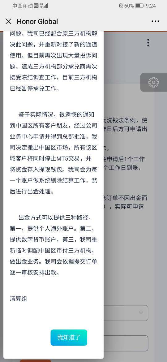 出金不到账 后台mt5账号 入金历史 做单历史 都给抹平了 发了个公告说是退出中国区 我怀疑就是拖延时间 应该是个黑平台资金盘