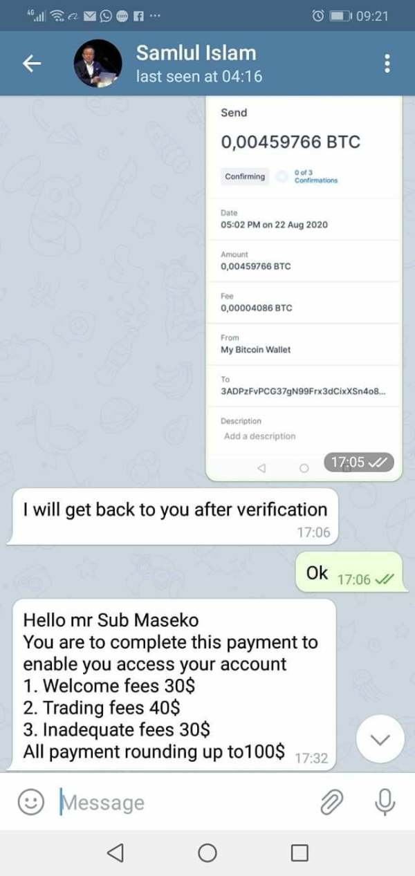 I was scammed of 50$, I was told to come invest and pay 50$ for verification, that was the only thing I was told before. after the Payment he listed some fees to me like the trading fees, welcome fees, inadequate fees, making all Payment round up to 100$, I told him I can't pay, he blocked me and I lost my 50$ to the scammer. beware of them. Thanks for the privilege to expose them
