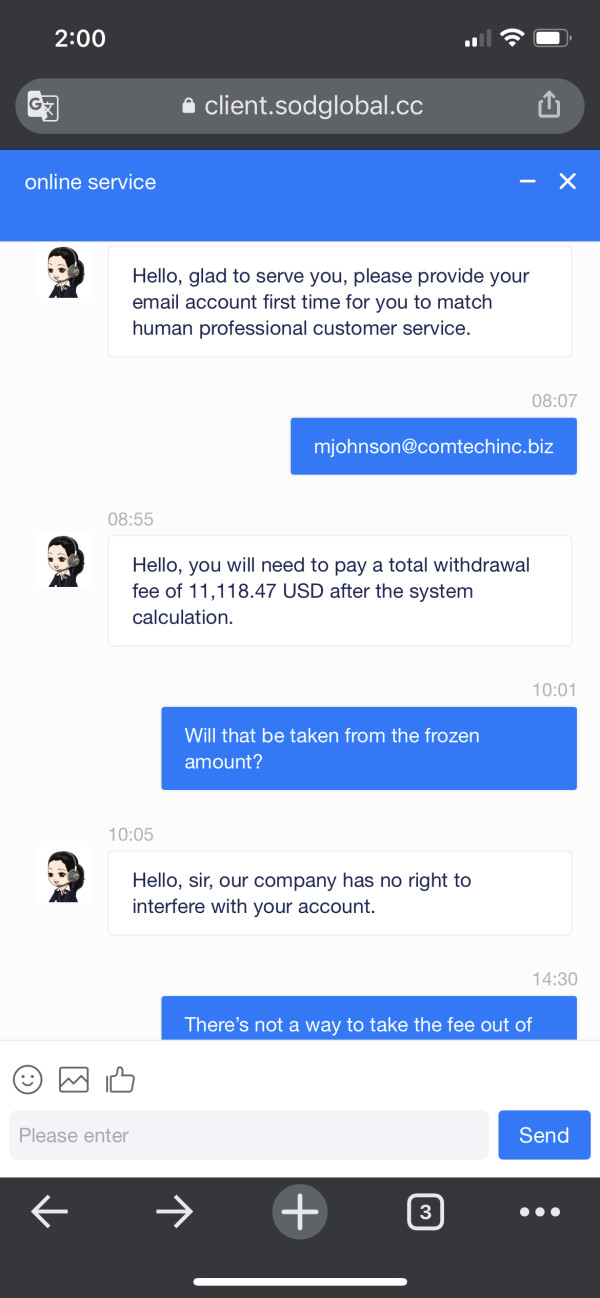 I’ve made a few small investments with this company over the past month without issue. After I made a larger investment and attempted to withdraw my earnings, they told me that I needed to pay a withdrawal fee of $11,118.47 to receive my money. I can’t have that amount removed from what’s being transferred, can’t cancel the withdrawal request, can’t pay a partial fee for a portion of the money, or change the amount being withdrawn. My funds are also frozen until the transfer is completed.