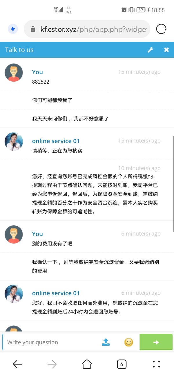 Tôi không thể nhận được tiền để rút và chuyển. Và sau khi nộp thuế thu nhập cá nhân, bộ phận chăm sóc khách hàng nói rằng sẽ nhận được tài khoản trong ba ngày, và để tôi thanh toán 10% số tiền gửi an toàn.