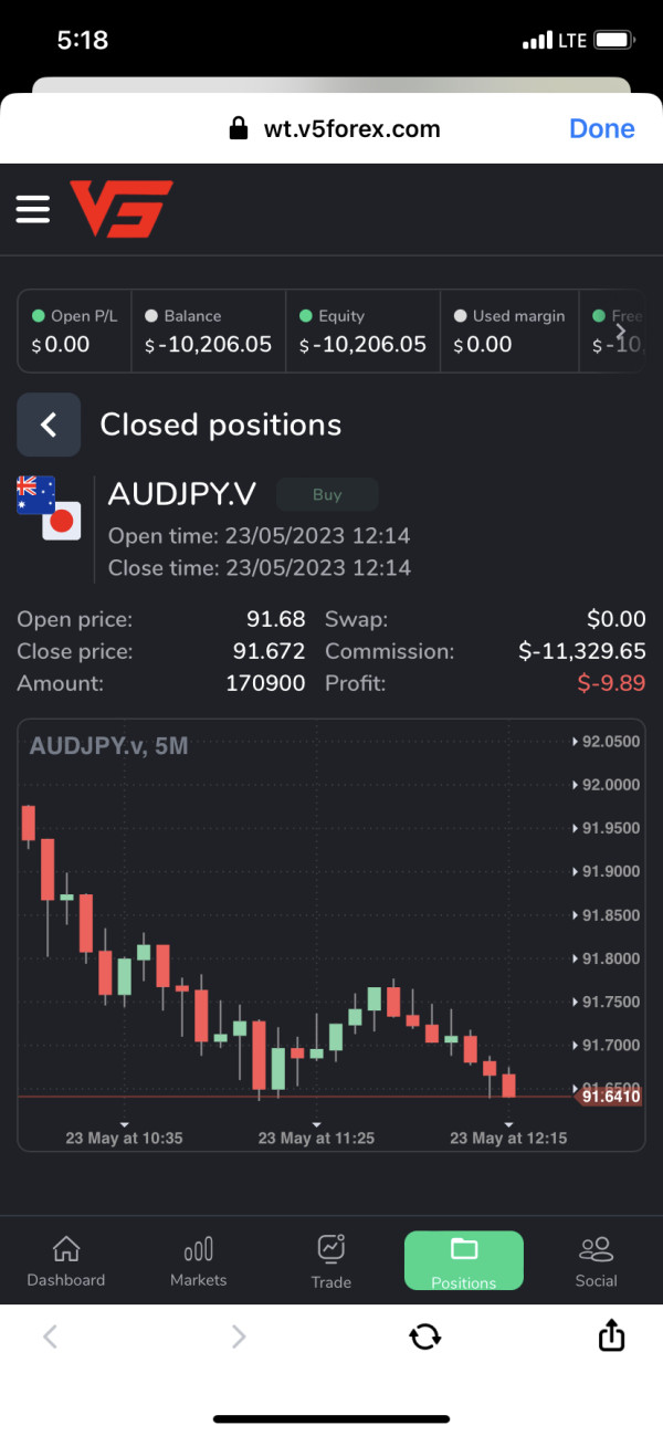 Good day! I traded last May 23,2023, 5:14pm Philippine time for AUDJPY and when I started/open the trade it automatically closes and my capital becomes negative i a span of less than a second. the profit is -9.89usd and the commission is -11,329.65 usd. No broker in the world will charge the trader 10 times of its capital. I want to recover my funds/Capital asap. Attached herein are my trading for AUDJPY and my Capital (1,127.16usd) before trading. thank you