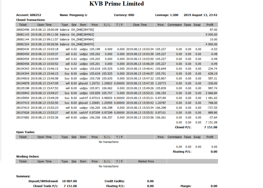 您好,我是kvbprime的客户李鹏鹏,MT4账户:608252,于2019年8月13日晚上15:46分左右在kvbprime平台上交易,盈利7151.08美元利润,后来这几单交易被贵公司删除,之前听身边做外汇的朋友都说KVB怎么好怎么好很讲信用旧抱着先试试的心态先投了1万美金到贵平台试试,刚入金当天就盈利了7000多美金我还特别开心,后来咨询客服后才说因为数据错价被回滾删除了 , 这样显然我是接受不了的,这和强盗打劫的行为没有什么区别,好在是挣钱了,要是亏本了平台你们会怎么做,这样的作法是对客户的不负责任的一种行为,而你们客观的找理由,在我们不知情的情况下,擅自抹掉交割单,压根不符合监管要求,第一,我们建仓是按照你们平台报价来下单交易,具体也是以你们平台为准,不接受什么错误报价 第二,即使你们错误报价损失那是你们平台技术过失,不能让客户来承担 第三,我们在其他平台做交易都是正常的,而你们在不知情的情况下删掉我们的盈利交割单,明显是在赖账,我们在其他平台做这么多年了,第一次听说有错误报价这回事!赚钱你们都给抹掉,哪条监管同意你们可以这样做! 你们公司可以修复报价
