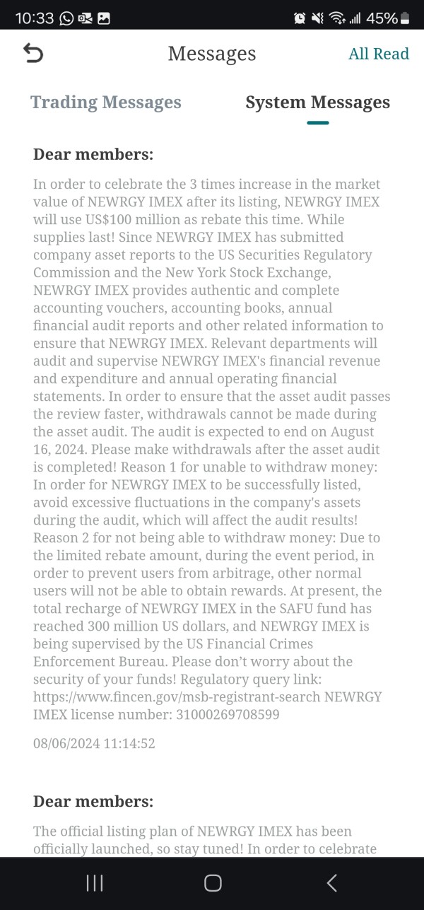 El día 6 de agosto Newrgy Imex detuvo los retiros, según ellos hasta el día 16 de agosto, porque se estaban incorporando a la NYSE. El día 16 Newrgy imex nos notifica qué ya están abiertos los canales de retiro y aparentemente todo iba bien. El día de hoy, 19 de agosto, Newrgy Imex nos avisa que los retiros quedaron congelados porque no hemos presentado impuestos en Estados Unidos con la forma 1040 nr, sin embargo los impuestos se presentan cada año, si yo operé en 2024 tengo que presentar impuestos el 2025. Anexo pruebas y espero nos puedan guiar para proceder legalmente.