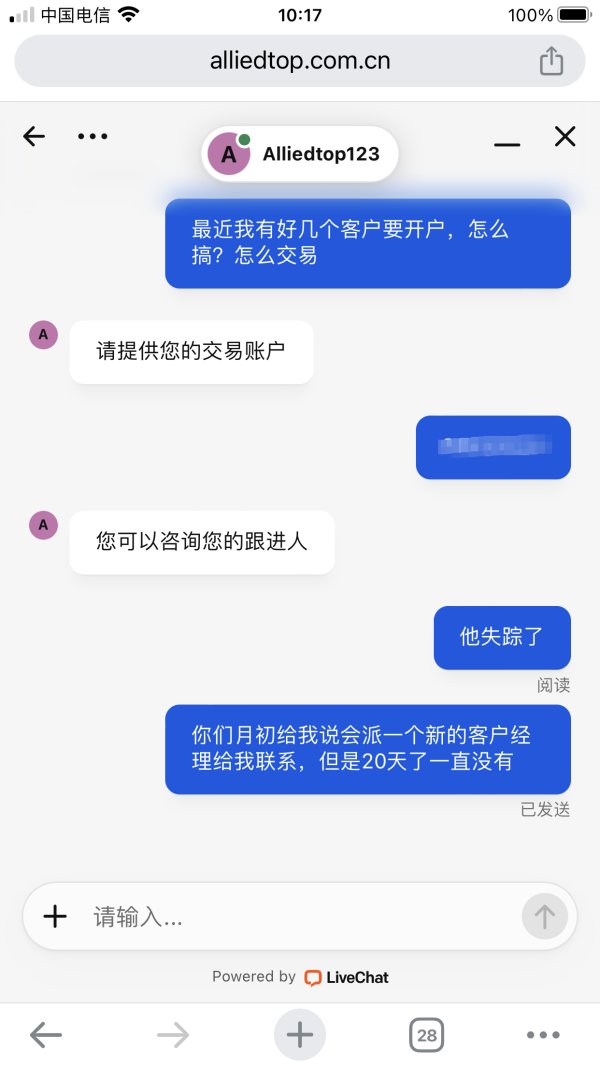 63万资金无法出金,目前已经20天了,前几天是咨询在线客服,一直让我联系我的对接人,可是我对接人是信息不回,电话不接,现在干脆官网直接关闭了在线聊天窗口,全部失联