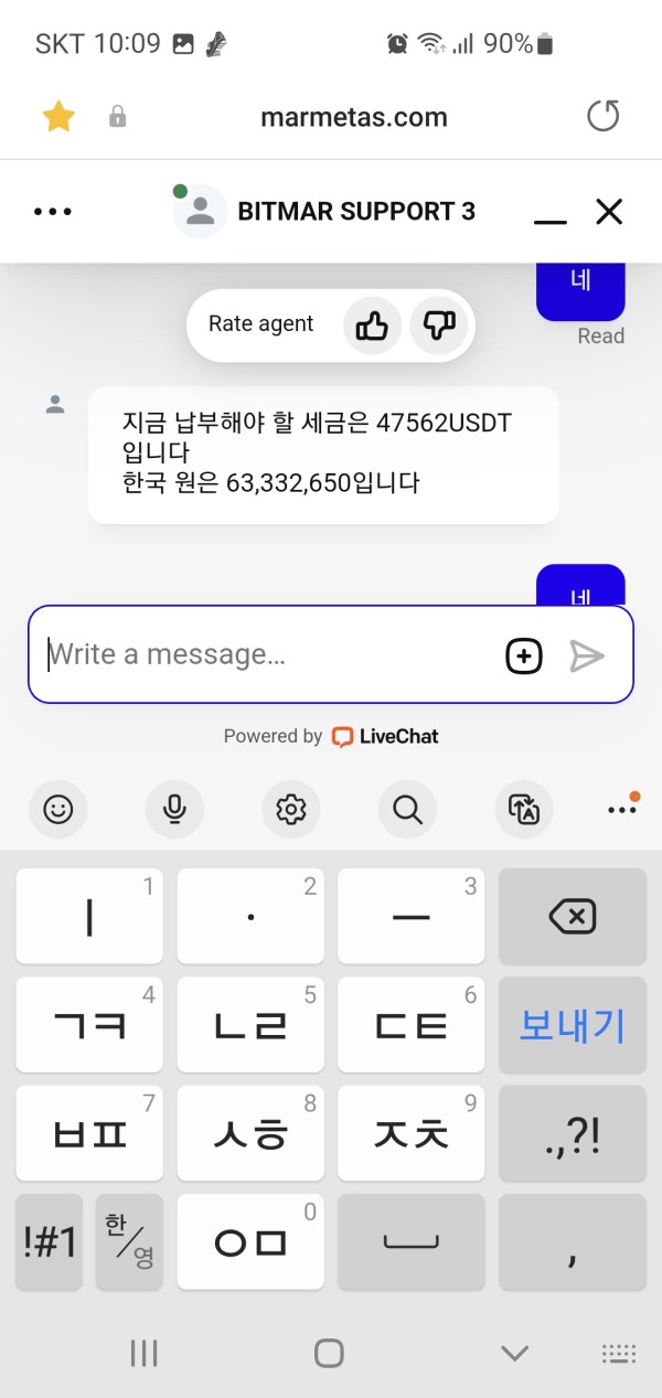 안녕하세요. 중개 업소에 BITMAR 가 선택이 안되어서 BITMART 선택했습니다. 2024년 1월 2일 부터 BITMAR라는 거래소 홈페이지 https://marmetas.com https://www.bitmarmeta.com 에서 선물 거래를 하던 중 2024년 2월 14일에 자금이 필요하여 거래소에 출금을 요청 했지만 거래소에서는 자금세탁 등으로 계정에 문제가 생겼다며 자금 466305 USDT를 일시에 출금을 하라며 세금 한국 원화 63332650원을 먼저 납부 해야지 출금이 가능 하다고 합니다.어렵게 세금을 완납 했는데 이제는 거래소에서는 보증금 한국원화 23163000원을 먼저 납부해야지 출금이 가능하다고 합니다.어렵게 보증금을 완납 했지만 거래소에서는 온갖 핑계로 지금까지 (2024년 4월 29일) 출금을 안해 주고 있습니다.