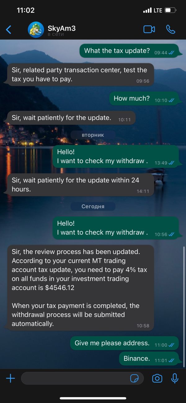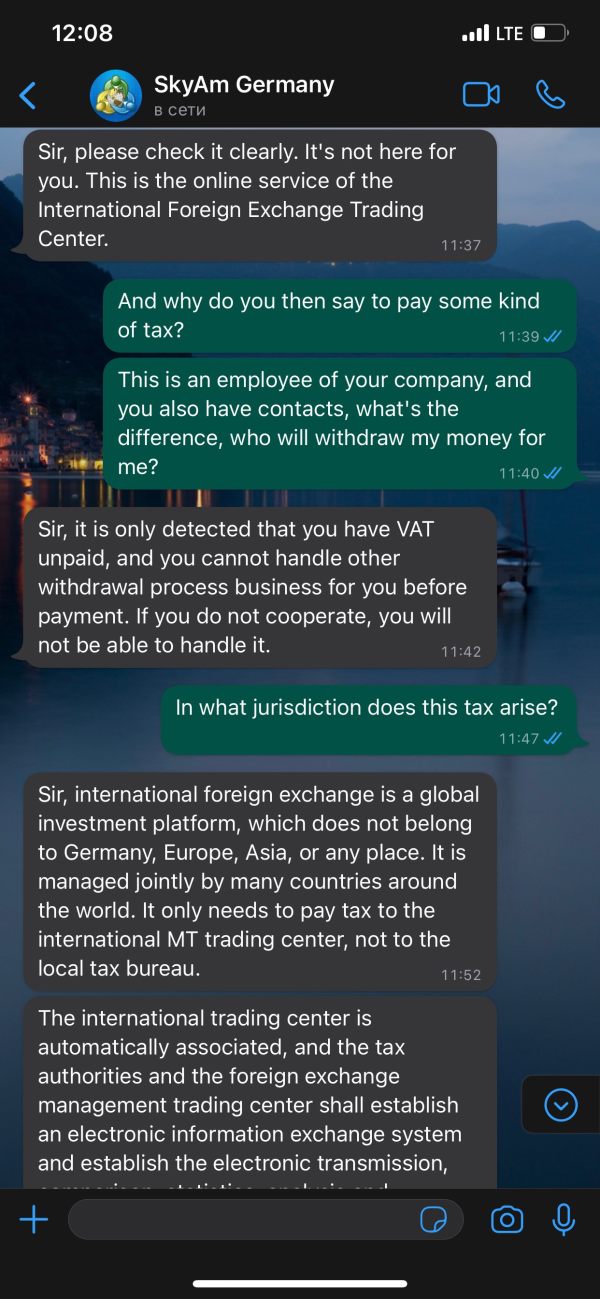в продолжение истории по отсутсвию возможности вывода денег с платформы. я нашёл ещё контакты этого «брокера», которому так же написал, что я хочу вывести часть денег со своего торгового аккаунта, и тут появилась новая история про налоги которые я должен оплатить, но в какой юрисдикции и почему я должен платить там налоги, сервис не может объяснить. так как я плачу налоги там, где являюсь налоговым резидентом. не отправляйте ни одной копейки этому брокеру, вы просто потеряете эти деньги. А новые причины о невозможном выводе будут возникать и дальше, до бесконечности. вот контакт который работает по Германии: +49 1520 6031314 контакт который называется международной торговой организацией по валюте МТ4: +1 (571) 461-5038. не доверяйте этому брокеру и не доверяйте предложению заработка на торговле, если вы лично не знакомы с человеком и гарантом вывода Ваших средств.