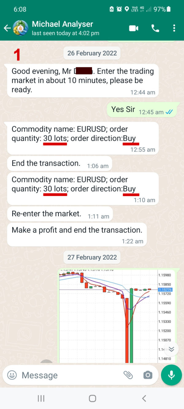 Photo 1, 1a: Instruction given by Michael, the analyst on Friday night 25 Feb 2022Photo 1a: Right after the spike, I showed Michael the evidence of manipulation by comparing the charts of Skyam Invest with charts from 2 other platforms that did not have the spike. Under the spike there was no big volume that supported the fluctuation of the market. These are evidences of manipulation and scams.Photo 2: Michael kept silent since 27 Feb 2022Photo 3: Shows Michael knew what had happenedPhoto 4: "...if you want to withdraw money you need to return the money first..." So this is the purpose to blow up my account to a negative -2749.50.Photo 5: Michael is responsible for: no stop loss given.Photo 6: The first time Michael blew up my account was on 18 Nov 2021.Photo 7 and 8: on 18 Nov 2021, Michael’s instructions also had no stop lossPhoto 9: Who would dare to follow the instructions of this analyst to trade?To sum up, Michael, the 15 year analyst does not have risk management. He is the person who gives customers instructions to win and to lose all. These scams were all plotted! He would take 8% of the profit but not pay 8% of your loss. The server manipulation could not be successful if there is no participation of the analyst.Skyam Invest must compensate me 127,000 USD for the unfair MT4 server manipulation with the accomplice of the analyst on 25 Feb 2022.