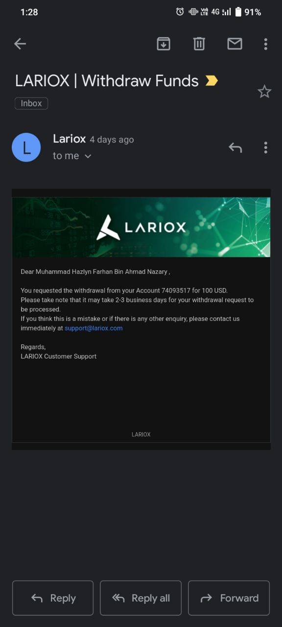 六个月前我用过这个 Lariox,它让我很失望。点差突然上升了 100 多个点,最后我输光了所有存入的资金。他们还让我多放,我拒绝了,离开了这个骗子。