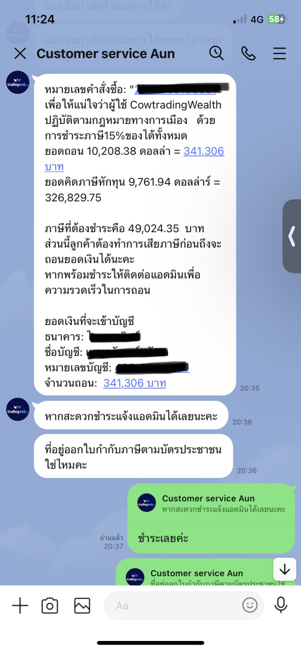 1. เริ่มลงทุนจากคนรู้จักชักชวน จากนั้นเติมเงินลงพอร์ต 15,000 บาท (ประมาณ 500 เหรียญ) ปล. คนรู้จักเล่นกับโบรกเกอร์ Cowtrading Wealth มาแล้วเกือบ 1 ปี 2.คนนำเล่นพาเทรด ซึ่งต้องจ่ายค่านำเล่น 30% ของกำไร จำนวน 44,222 บาท 3. แจ้งถอน แอดมินฝ่ายบริการแจ้งว่าต้องจ่ายค่าภาษี 15% จองยอดที่แจ้งถอน จำนวน 49,024.35 บาท ต้องจ่ายการเท่านั้นค่าภาษีจะไม่หักจากยอดที่เราถอน (เริ่มเอ๊ะครั้งแรก) 4. แอดมินแจ้งต้องขำระค่าอัตราแลกเปลี่ยนอีก 4.5% จำนวน 15,358.77 บาท 5. แอดมินแจ้งต้องชำระค่าบริการตรวจสอบฟอกบัญชีสำหรับการถอนครั้งแรก 10% ของเงินที่ถอน จำนวน 34,130,บาท (จะได้รับเงินคืนพร้อมยอดที่แจ้งถอน) 6. แอดมินแจ้งต้องชำระค่ายืนยันตัวตนลูกค้าใหม่ที่ถอนครั้งแรกอีกจำนวน 25,555 บาท (จะได้รับคืนพร้อมยอดถอน) 7. จากนั้นแอดมินเริ่มเงียบหาย เราจึงสอบถามการเร่งถอน โดนไปอีก 10,000 บาท 8. เมื่อถึงวันเวลาที่ได้ต้องได้รับยอด แอดมินเริ่มเงียบ ไม่ตอบไลน์ และหายไปในที่สุด