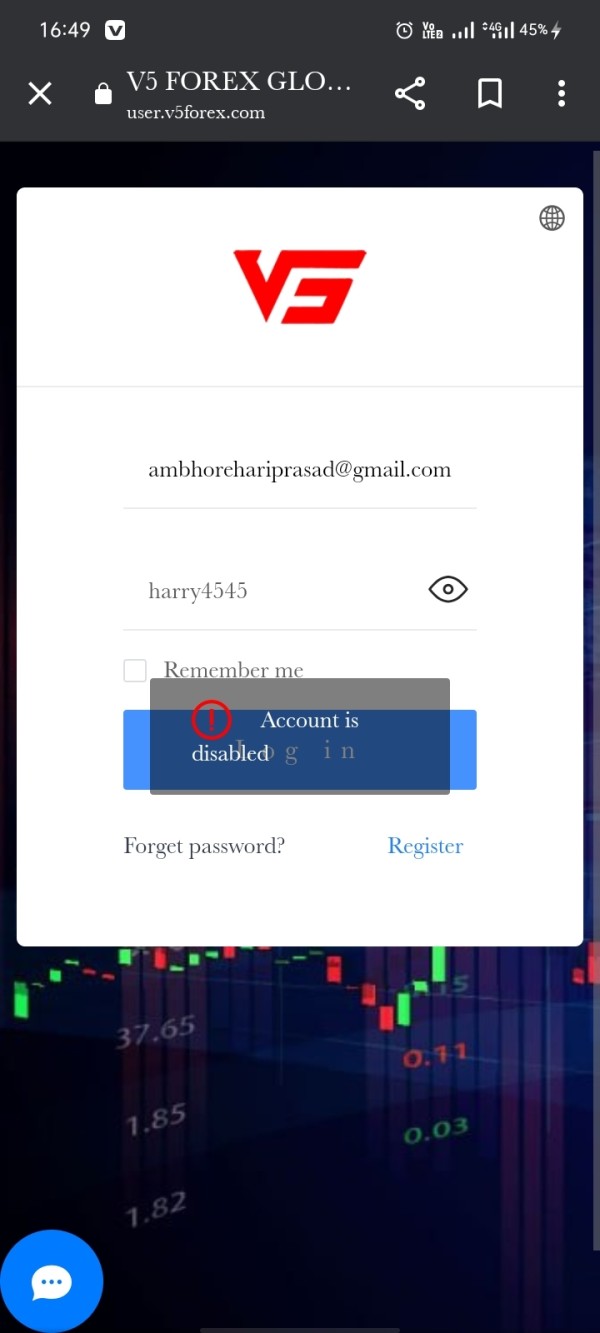 accout no 8365775 e-mail - ambhorehariprasad@gmail.com my V5 forex account is now automatically disabled only the trading web is on but iam not able to do any activity on V5 i have provided all the necessary documents to technical department to resolve my problem but still my account is disabled i have total 213 usdt in my account i have withdrawn 75 usdt that has not received and also 138 USdt that not also of my used because of certain account disability
