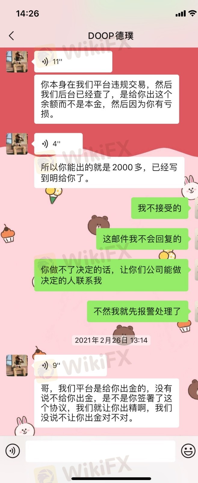 本人于2020年4月份在德璞开立账户交易外汇,前后入金4次,总金额1万4千美金,期间持续交易,没有盈利,略有亏损,出金9800美金。后在2021春节假期交易获得盈利1万3千多美金,2月份申请出金,迟迟没有回应。后来交易账户和后台直接登录不上,联系客服让我等处理,之后就收到邮件,说我在他们平台的账户违反了他们平台的交易规定,直接扣除掉我的所有盈利,退回账户资金4718美金。沟通未果,后又收到邮件,再次扣除本金2395,1万8美金的账户只能出金2323美金。盈利和本金想扣多少扣多少,都是平台说了算吗???说我的盈利都是违规,然后亏损的部分直接扣本金,做这个平台快1年了,没想到最后本金都拿不回来。大家一定要擦亮眼,远离黑平台