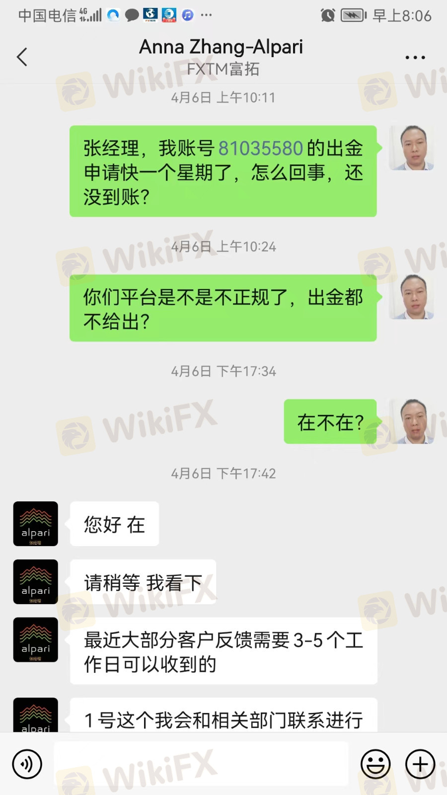 我帐户81035580帐户2022.4.1日 申请出金2301美元,现在十几天了还没有到帐,客服老说是在等支付商调查回复,这是要去医院住院的救命钱,请给我作主,尽快处理到帐,非常非常感谢