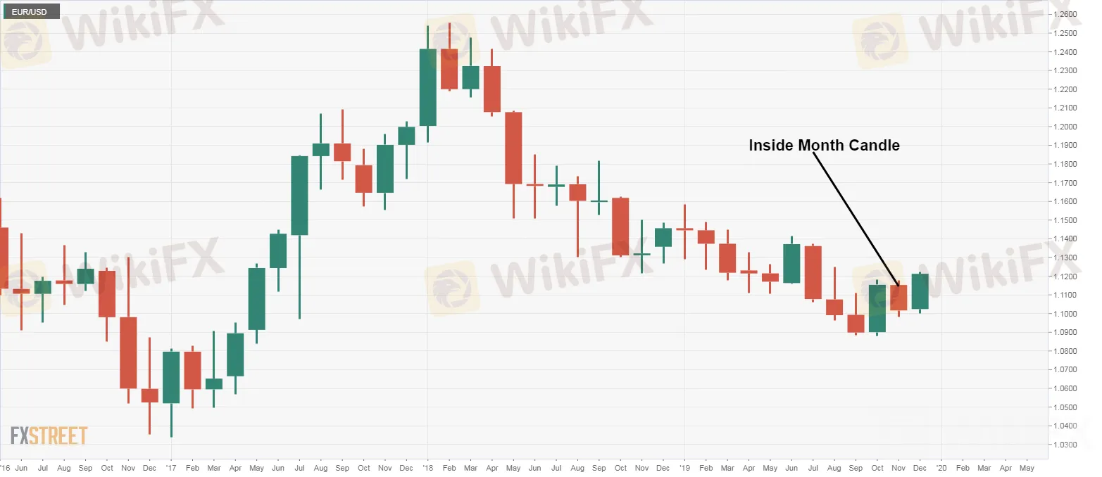 11月欧元/美元走出看跌内K线,该形态表明汇价开盘上涨,但收盘下跌,价格波动处在上个交易日的高位和低位区间内。