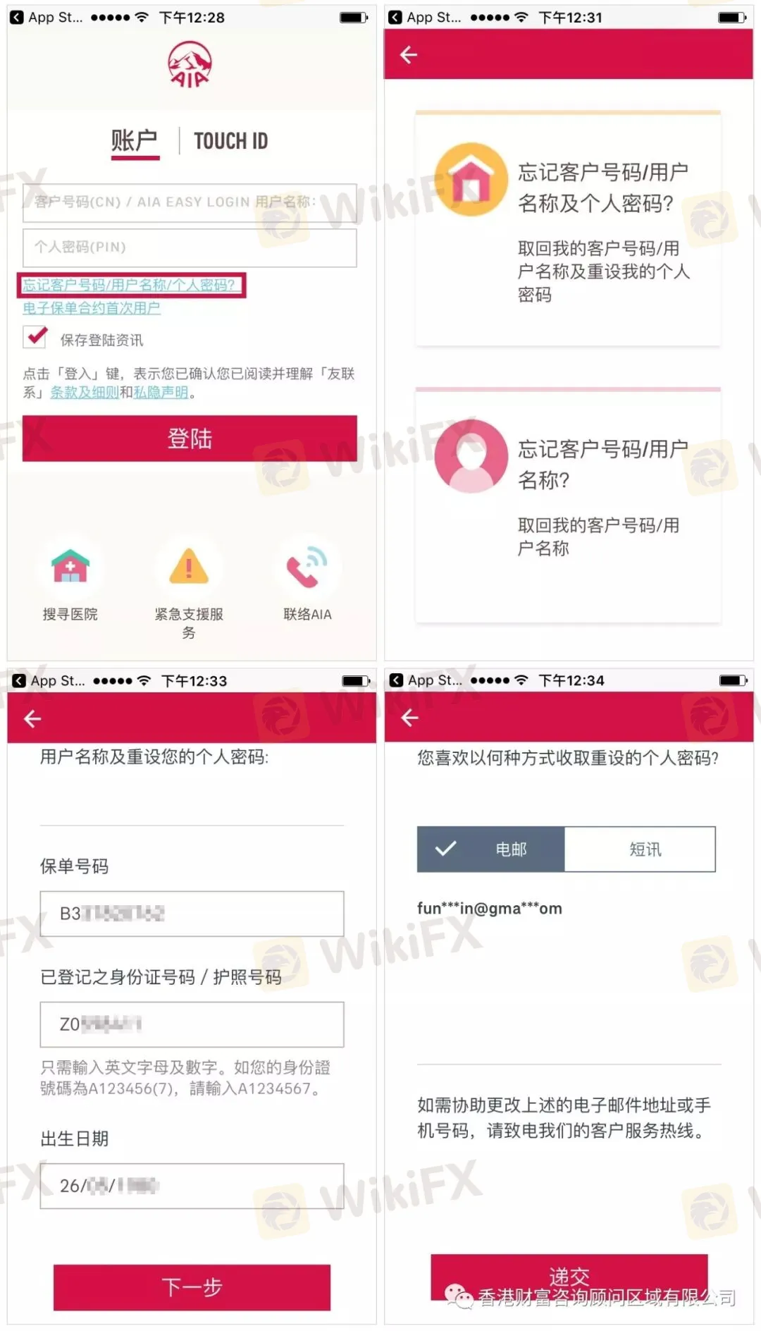 可直接输入客户号码 / 个人客户及个人密码,若已忘记話,请按“忘记客户号码/用户名称/个人密码”,输入“保单号码”、“身份证号码”和“出生年月”后,选择使用电子邮箱或手机进行接收新密码,便可以5分钟内收到新密码,以新密码进行登陆便完成登陆步骤了(保单号码和客户号码可以先找理财顾问获取)