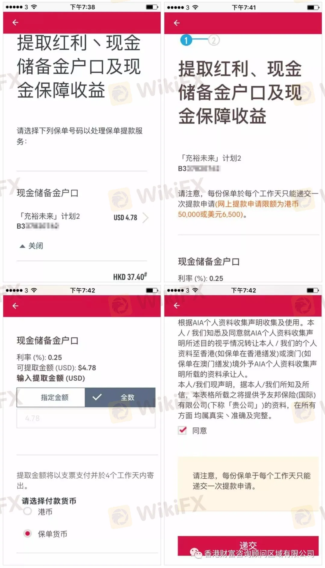 进入保单管理自助服务后,可选择提取的金额和提取的货币使用是港币或美元。提交申请后,公司会在四个工作日内把支票给到您的理财顾问。