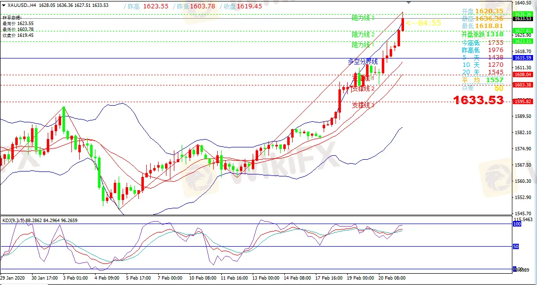摘要:2020年2月21日 星期五黄金昨高1623.55美元/盎司,收盘在1619.45美元/盎司,再次刷新多年新高。今日开盘在1620.35美元/盎司,日内最高到达1636.36美元/盎司,突飞猛涨。重要事件北京时间22:3