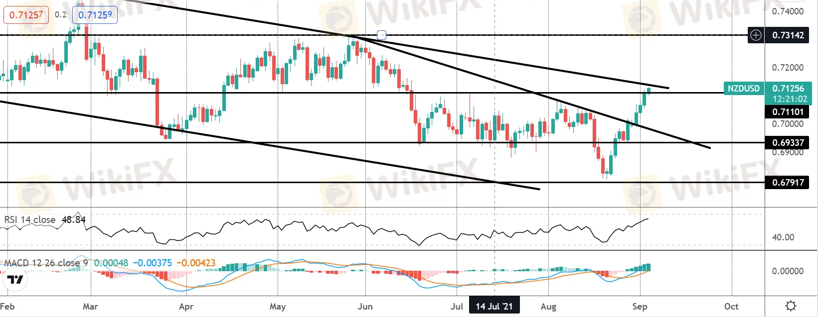 此外,新西兰央行是 G10 央行中最鹰派的央行之一。由于新西兰央行已于本月宣布结束量化宽松政策,并明确表示打算尽快加息,因此新西兰元拥有很大的上行前景,这应该会在未来几周内保持新西兰元兑美元的支撑,前提是没有在今天的数据的支持下,美元上涨烟花。所以这是基本背景,现在让我们看一下技术图。
