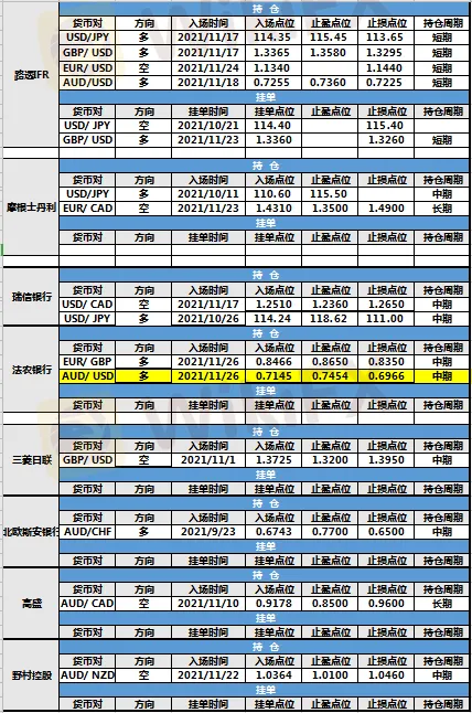 持仓方面,法农银行澳元兑美元仓位调整,入场点位调整至0.7145,止盈点位调整至0.7454,止损点位调整至0.6966,目前处于持仓中。