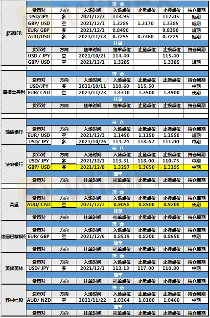 持仓方面,法农银行、高盛两投行仓位调整。法农银行英镑兑美元止损点位调整至1.3195,目前处于持仓中。高盛澳元兑加元止损点位调整至0.9200,目前处于持仓中。