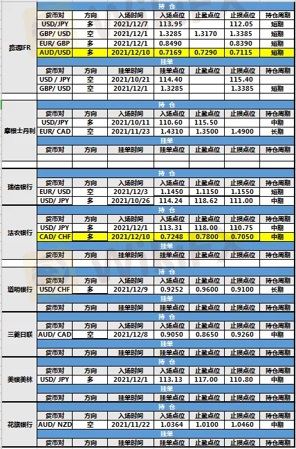 持仓方面,法农银行、路透IFR两投行仓位调整。法农银行加元兑瑞郎入场点位调整至0.7248,止盈点位调整至0.7800,止损点位调整至0.7050,目前处于持仓中。路透IFR澳元兑美元入场点位调整至0.7169,止盈点位调整至0.7290,止损点位调整至0.7115,目前处于持仓中。