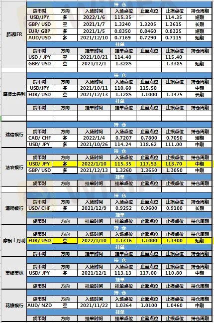 持仓方面,法农银行、摩根士丹利两投行仓位调整。法农银行美元兑日元入场点位调整至115.35,止盈点位调整至117.53,止损点位调整至113.70,目前处于持仓中。摩根士丹利欧元兑美元入场点位调整至1.1316,止盈点位调整至1.100,止损点位调整至1.1400,目前处于持仓中。