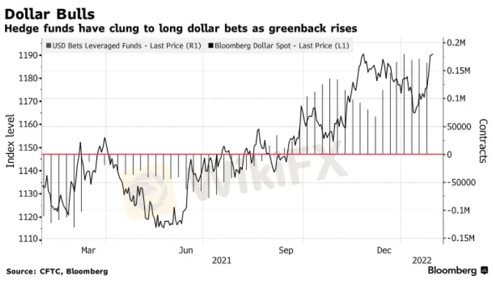 在上周美联储主席鲍威尔的鹰派讲话之后,市场对今年加息5次的预期一直在升温,并引发了做多美元的押注,上周美元指数自2020年7月以来首次站上87关口。富国银行Mike Schumacher等策略师表示: