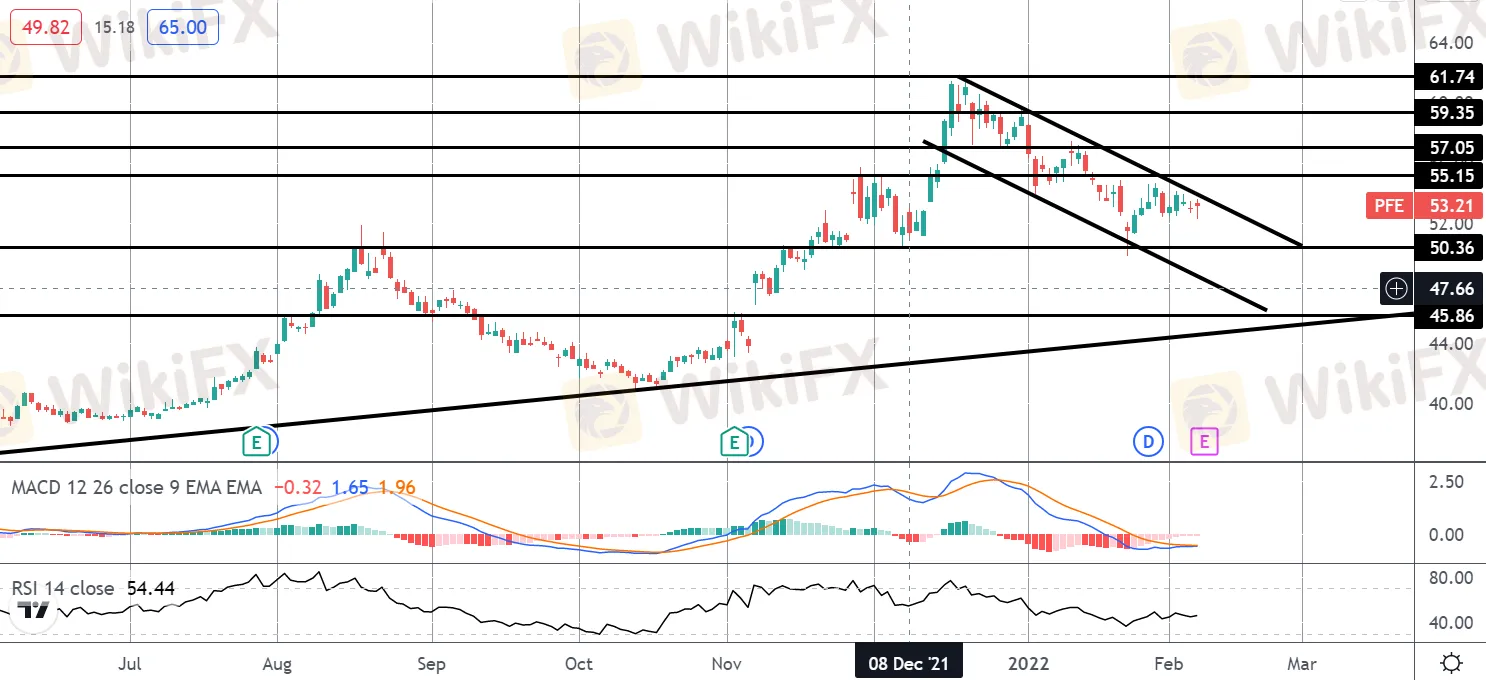 美国制药巨头辉瑞公司今天成为焦点。 该公司报告了 2021 年第四季度的收益,交易员将热衷于利用发布前后的任何波动。 辉瑞股价近几个月一直在走低,从 12 月创下的 61 美元以上的历史高点回落至目前的低点 53 美元左右。 下跌是由一个明确的熊市通道构成的,虽然价格仍高于长期看涨趋势线,但可以被视为一个修正牛旗结构,表明有突破通道并继续走高的空间。 今天的收益发布会为这一举措提供催化剂,还是我们会看到抛售加剧?