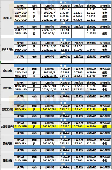 持仓方面,两投行仓位调整。巴克莱银行入场点位调整至115.02,止盈点位调整至118.60,止损点位调整至113.50,目前处于持仓中。法国巴黎银行入场点位调整至0.7150,止盈点位调整至0.7500,止损点位调整至0.6980,目前处于持仓中。