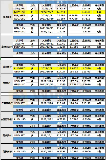 持仓方面,路透IFR、瑞信银行仓位调整。路透IFR英镑兑美元入场点位调整至1.3740,止损点位调整至1.3530,目前处于持仓中。瑞信银行澳元兑纽元入场点位调整至1.0670,止盈点位调整至1.0870,止损点位调整至1.0550,目前处于持仓中。