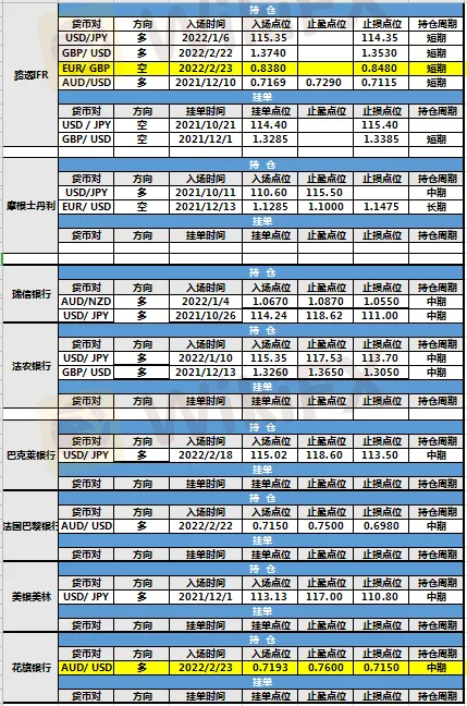 持仓方面,路透IFR、花旗银行仓位调整。路透IFR欧元兑英镑入场点位调整至0.8380,止损点位调整至0.8480,目前处于持仓中。花旗银行澳元兑美元止损点位调整至0.7150,目前处于持仓中。