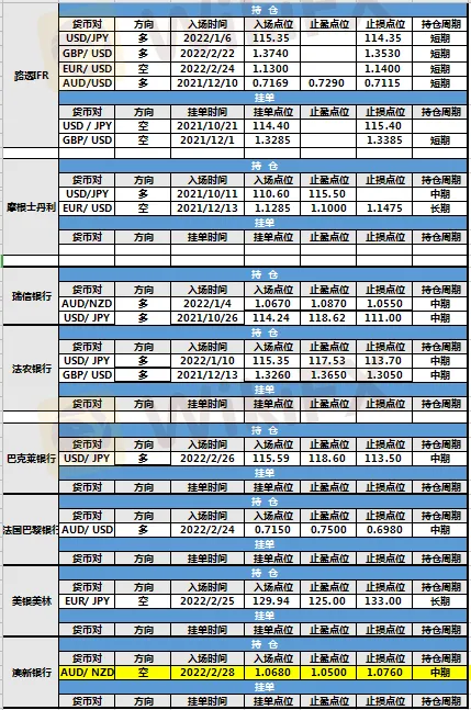 持仓方面,澳新银行澳元兑纽元仓位调整,其他投行仓位保持不变。